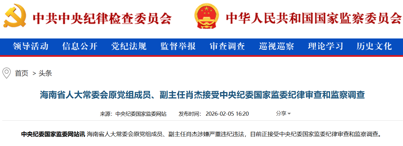 曾经的南海前沿开拓者,如今在中央纪委国家监委的审查调查中成为反腐的最新注脚,职务光环与法律面前人人平等的原则形成鲜明对比。海南省人大常委会原党组成员、副主任肖杰涉嫌严重违纪违法,正接受中央纪委国家监委纪律审查和监察调查。这位曾任三沙市首任市委书记、市长的官员,曾主政中国最年轻的地级市近五年时间。肖杰的落马并非孤例,2026年以来中央纪委国家监委网站公开通报审查调查的中管干部已达10人。01 案件焦