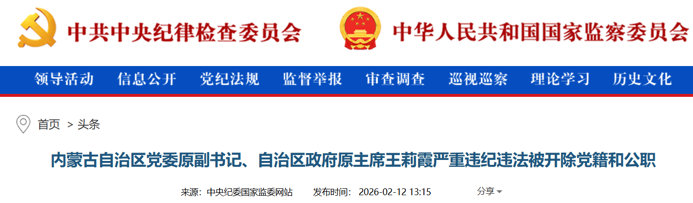 中央纪委国家监委网站一则仅数百字的通报,却勾勒出一名正省级高官从“励志典范”滑向腐败深渊的完整轨迹。2026年2月12日,第二十届中央委员、内蒙古自治区政府原主席王莉霞被开除党籍和公职,其涉嫌犯罪问题移送检察机关依法审查起诉。这位曾以“救火队长”身份主政首府、被誉为“草原女王”的女性高官,最终以“严重背离‘两个维护’”“阳奉阴违、自行其是”“贪慕虚荣、追求享乐”“家风不正、失管失教”等罕见严厉措辞