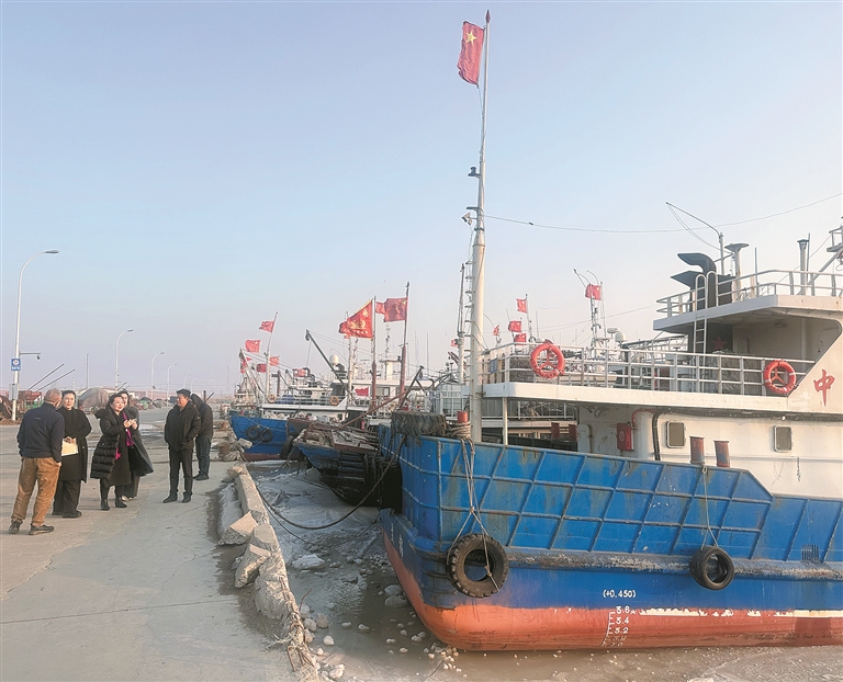 图为近日,辽宁省盘锦市大洼区纪委监委会同区农业农村局等部门工作人员组成工作组,前往二界沟中心渔港走访,了解渔业安全生产等情况。张牧笛 摄清晨六点,辽宁省盘锦市大洼区二界沟中心渔港在辽东湾凛冽的海风中醒来。冰封的海面上,一艘艘钢质渔船桅杆林立,码头的车间里,一台台设备被精细保养,为即将到来的开海做着准备。距离渔港大约三公里处,是一排排被炊烟熏暖的砖房,素来以辽东湾为施捕渔场的渔民聚居在这里。20
