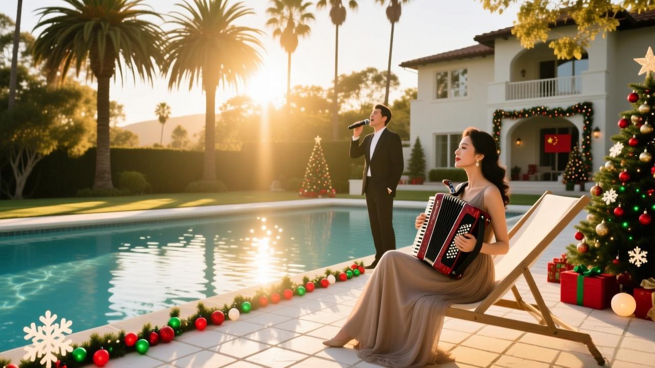 手风琴的旋律在加州豪宅的泳池边响起,熟悉的《我和我的祖国》歌声与棕榈树、圣诞装饰构成一幅充满张力的画面,迅速点燃了中文互联网的争议火药桶。近日,一段据称是相声表演艺术家姜昆在美国加州豪宅内与友人合唱《我和我的祖国》的视频在网络上流传,引发广泛争议。视频中,一行人围坐在带有泳池的豪华住宅环境中,以手风琴伴奏合唱这首经典爱国歌曲。背景中可见典型的南加州景观,包括棕榈树和私人泳池。随着视频传播,争议迅速