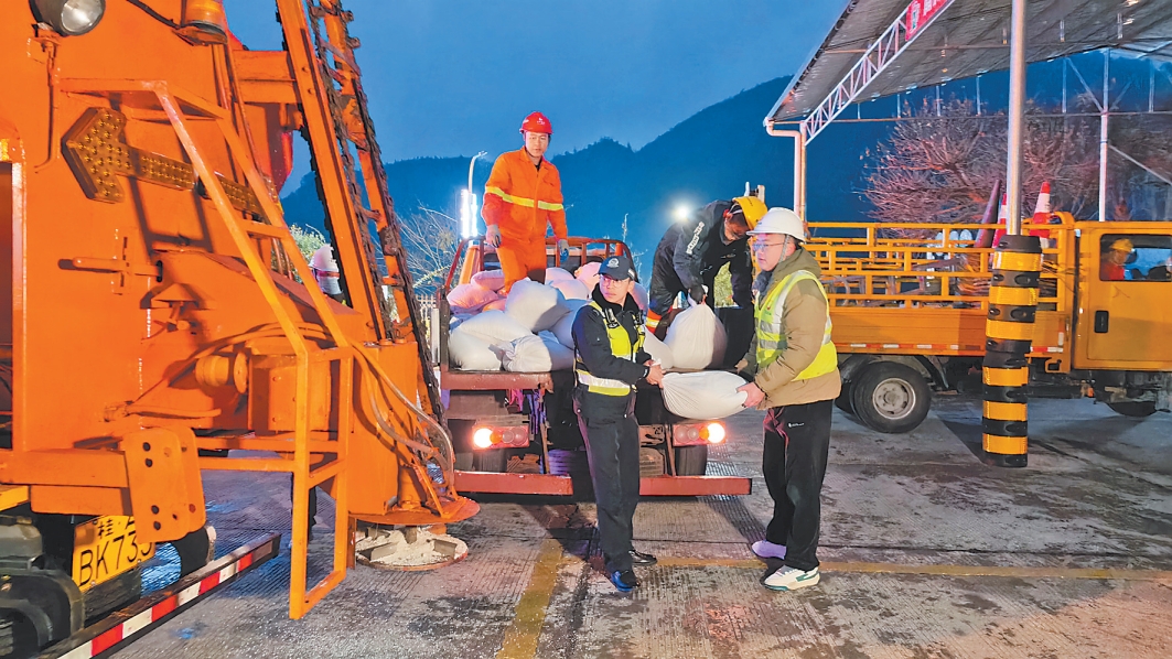 为守护路网畅通与司乘人员安全,河池市公安局交管支队高速公路管理三大队联合区直交通运输执法二大队等部门组成抗冰保畅党员先锋队,打响一场协同作战的抗冰保畅攻坚战。