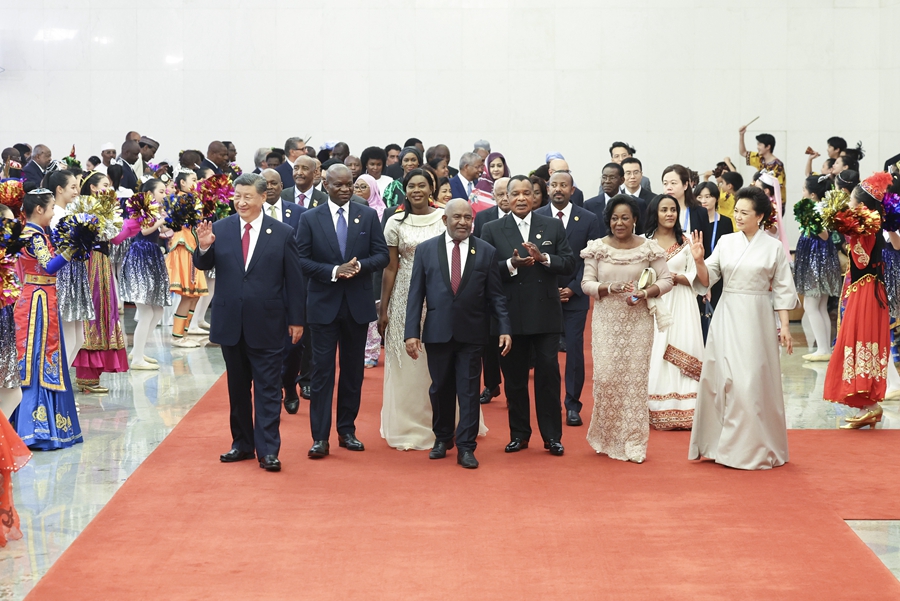 出席论坛峰会的51个非洲国家元首、政府首脑及配偶,2位总统代表,非盟委员会主席和联合国秘书长等贵宾陆续抵达人民大会堂。习近平和彭丽媛热情迎接,同他们分别握手问候,并集体合影留念。