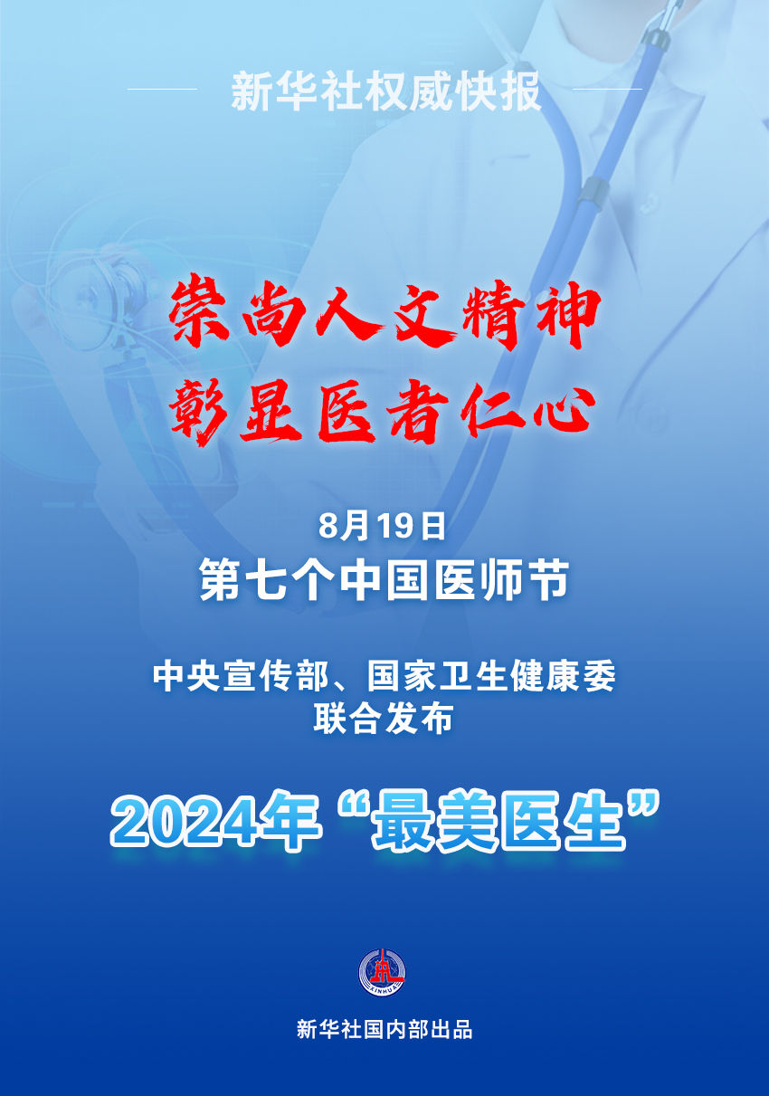 8月19日,第七个中国医师节,主题是“崇尚人文精神,彰显医者仁心”,中央宣传部、国家卫生健康委向全社会公开发布了2024年“最美医生”。朱兰、姜楠、陈静、翁心华、余家军、林丽珠、邓桂芳、李伯藩、侯新琳、毛里夏里甫·哈帕10名个人和活跃在全国各地的老年护理团队光荣入选。他们坚持人民至上、生命至上,以仁心仁术为人民健康服务,有的致力于推动医学科技创新,长期奋战在医学科研第一线;有的专注于发挥中医药防病