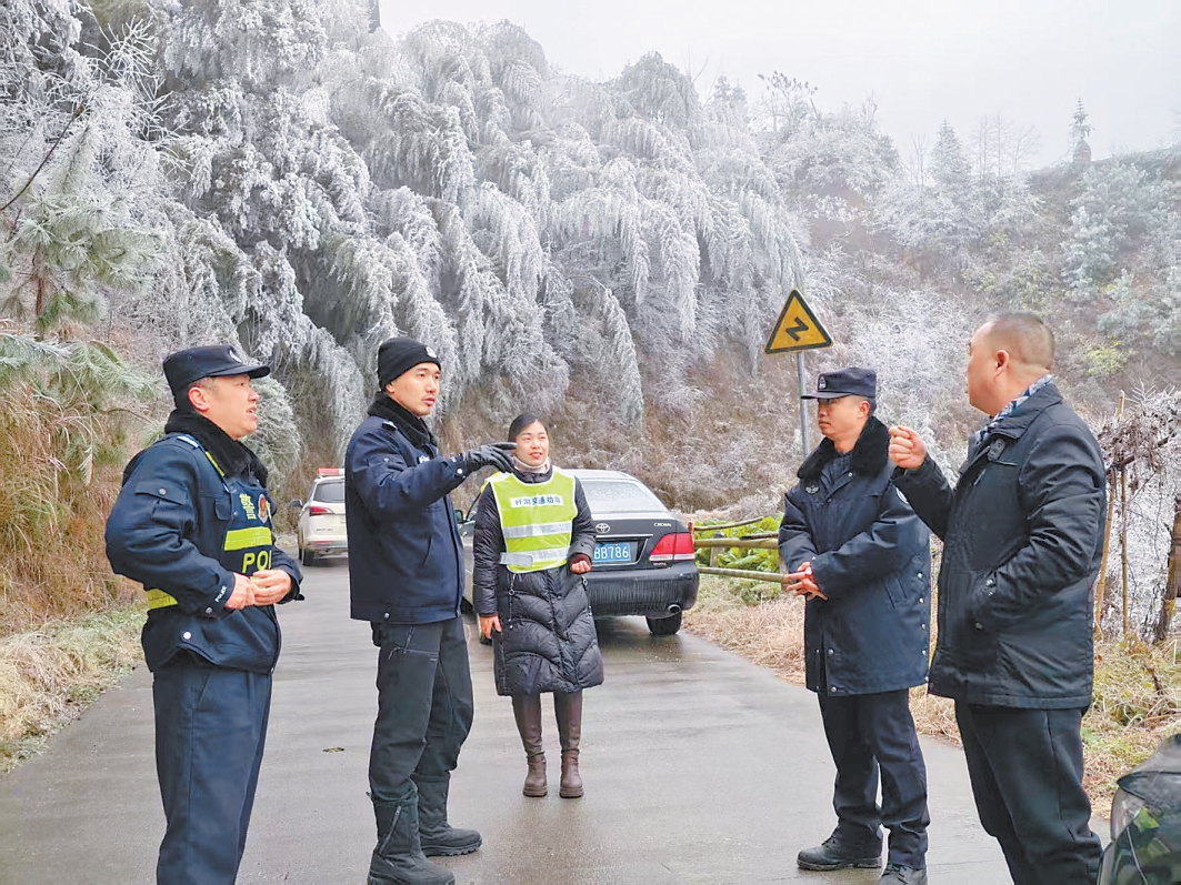 当天,三江县部分乡镇的气温降至冰点。该县良口乡白云山的草木化身“冰雕”雾凇,吸引了周边群众驱车前来观赏。三江县公安局良口派出所启动安保预案,加大巡逻密度,把平安送到群众身边。